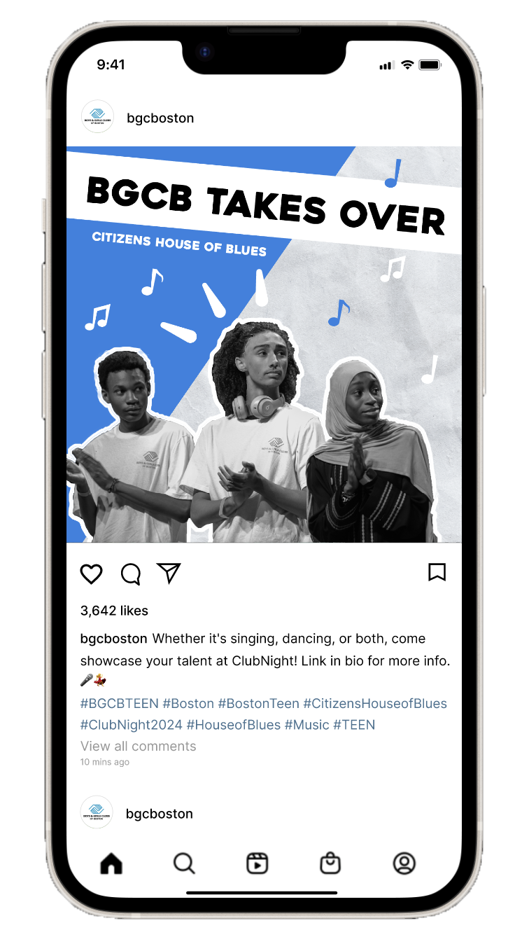 Our first promotional material we designed is a flyer for Rock-It. As for creative elements, we really want to reference Boston imagery because we are marketing the Boston Clubs not the Club of America. It also gives it a personalized touch as Boston building and imagery would be easily recognizable to Boston locals. We really want teenagers to be the center of our creatives because it shows that teens are attending the Club and could inspire others to do the same. Other elements include these blue and white doodles and lines to give it a more fun touch.